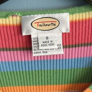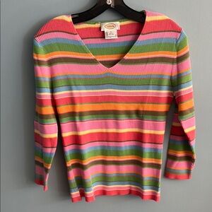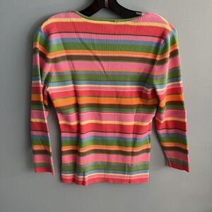 Brighten your wardrobe with this vibrant striped V-neck sweater. Perfect for any casual outing.