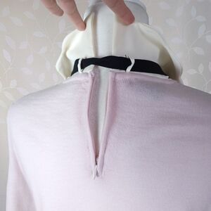 Adorable pastel pink sweater top crafted from 100% merino wool. Featuring a darling scalloped collar with black neck tie and 3/4 length sleeves. Lightweight and perfect for lovers of twee aesthetic, coquette fashion, and vintage vibes!