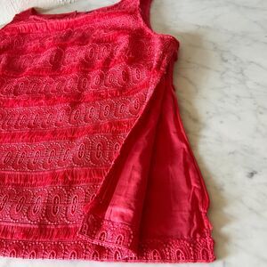 Talbots women's size PETITE 12 sleeveless top. Coral top has a round neckline with horizontal rows of eyelash fringe and lace. Front and back darts for fitted look. Side zipper and keyhole button back. Shell: 100% Polyester, Lining: 100% Cotton; dry clean.