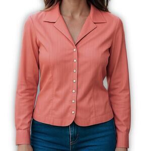 Talbots Coral Pink Herringbone Button Front Blouse Preppy Classic 10