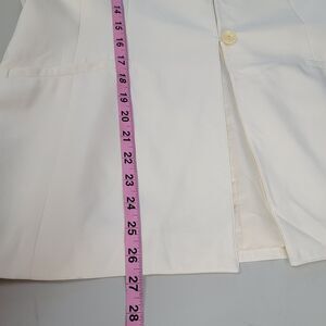 Elegant cream blazer with a classic design. Features a notched collar and button closure. Perfect for professional or casual wear. Worn once and freshly dry cleaned and ready for your closet!
