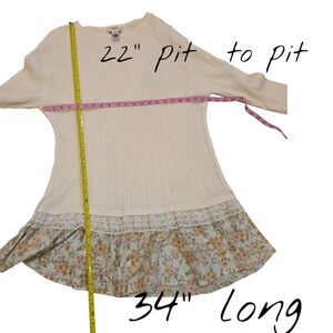 Talbots cream knit long-sleeve sweater with a delicate floral ruffle hem. Soft, feminine, and perfect for layered cottagecore or casual chic outfits. Can be used as a mini dress or tunic top. Tunic-length, long-sleeve sweater with a faux-layered ruffle hem. Neutral cream or beige, and the bottom ruffle features a light floral pattern. EUC