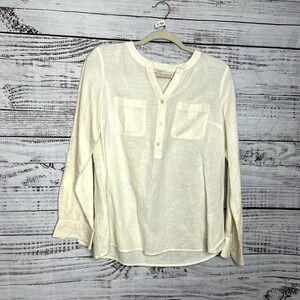 Talbots Cream Long Sleeve Tunic Top Linen Blend Pocket Blouse Medium P