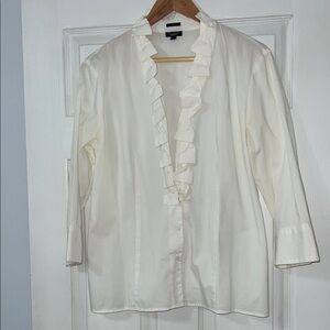 Chic cream blouse with ruffled neckline. Perfect for versatile styling.