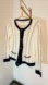 Chic and stylish women's cardigan sweater in classic deep navy and cream. Perfect for any occasion. Cute Front pockets. Fabric or size not labeled. Probably petite small.