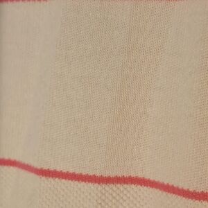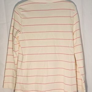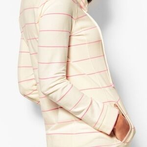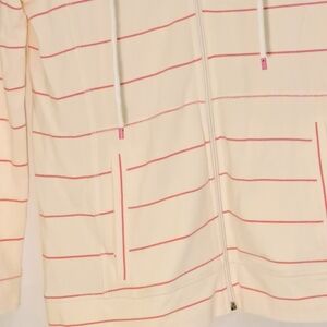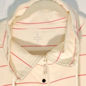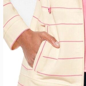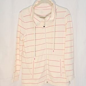 Stylish utility jacket by Talbots. Cream base with pink stripes. Features a zip front and drawstring collar. Perfect for casual outings.