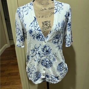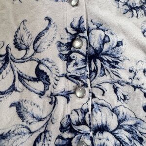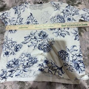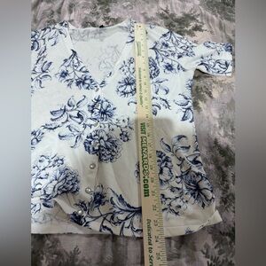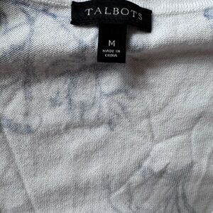 This elegant cream / off white background light weight sweater from Talbots features a classic button-down design with short sleeves, offering a sophisticated and versatile look. The light fabric ensures comfort, making it perfect for both casual and formal occasions. Good used condition. Plenty of life left . Smoke free home