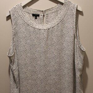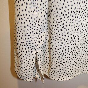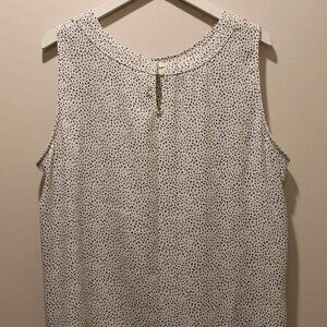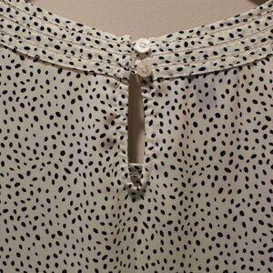 Talbots oh-so-feminine cream tunic with small black spots and back button closure. Crafted in a relaxed silhouette with side notches. Wrinkle-free fabric retains a crisp look from AM to PM. Always pristine and just right for work, travel and every day.