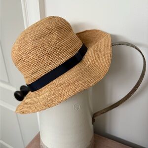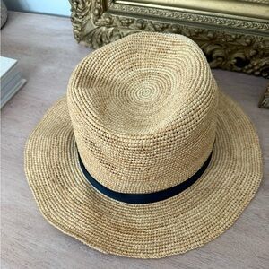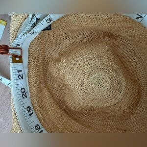 Material: 100% Crochet Raffia. Measures approx 21-22” inside. Great for travel as it packs well. Good used condition. It is the hat in the stock photo I just removed the embroidery because I didn’t like it.