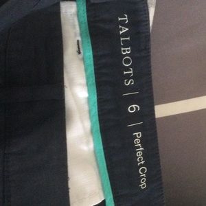 Talbots crops. Navy, small slit at bottom of legs, 2 functional back pockets, 2 flat functional front pockets. Worn 1 time. Too small for me. A little stretchy. Inseam 25 inches.