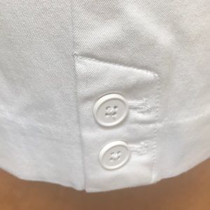 White/White button closure with buttons on pants legs. 2 back pockets
