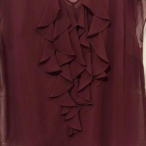 Chic blouse with cascading ruffles. Deep burgundy hue. Perfect for elegant occasions.