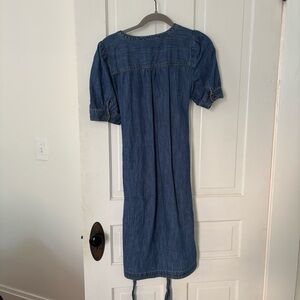 Stylish denim midi dress with short sleeves. Features a flattering tie waist. Perfect for casual outings.