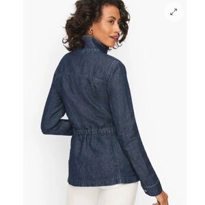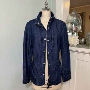 Talbots Denim Field Jacket. The wear-everywhere field jacket. It features a cinched waist that flatters and lots of pockets! Long sleeve. Hits at the hip. Zip front with snap placket closure. Drawstring cinch waistband. Snap patch pockets with top and side openings, and a zip chest pocket. In excellent condition. Size medium.