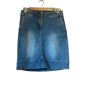 Keywords: denim skirt, pencil skirt, womens skirt, talbots, size 2, blue skirt, classic style, casual skirt, midi skirt, work skirt, denim pencil skirt