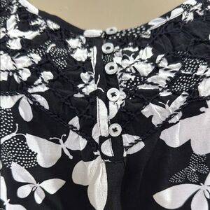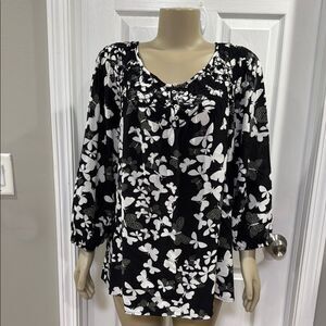 This stylish black and white top features a chic design. With smocking at the neckline and three-quarter sleeves, it is perfect for any occasion. The top is in excellent condition. The measurements are: pit to pit - 26 inches and length - 27 inches. It has a popover style with a straight hem and elastic cuffs.
