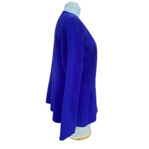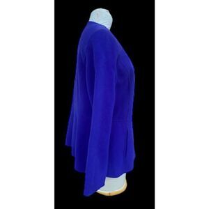Soft and structured, this jacket is a perfect outer layer. Long sleeves and a jewel neckline, 4 button front and on seam pockets. Center and waist seams make for a tailored fit. The color is a beautiful purple! Size 14 by Talbots.