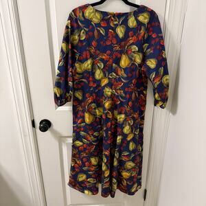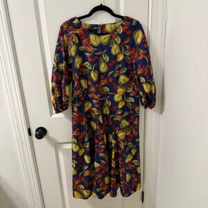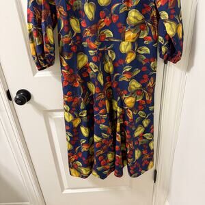 This delightful Talbots midi dress features a charming painted fruits print on crisp poplin fabric. The dress boasts a flattering silhouette with puff sleeves, perfect for adding a touch of elegance to your wardrobe.
