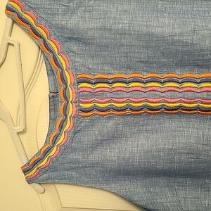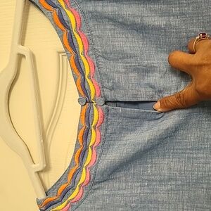 Lightweight denim sleeveless dress with embroidered small orange, yellow & navy scallops around the neck, down the front & at the bottom, excellent condition, Smoke & Pet-free home, Size 14