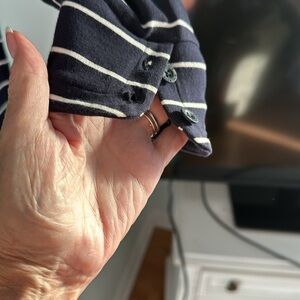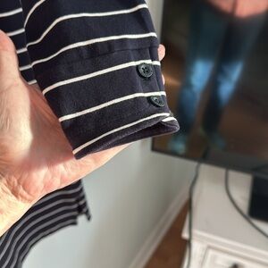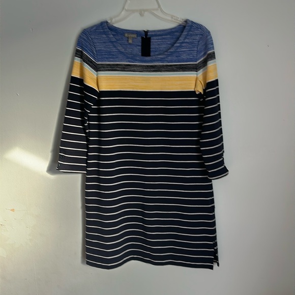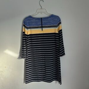 Talbots Dress, size XS, multi colored stripes on navy blue, 3/4 sleeves with 2 button closure, short back zipper closure, side slits at hem, 26” from pit to hem, sits above the knees.
