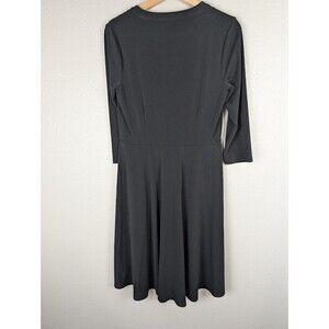 The Talbots Dress in black, petite size, is a classic and elegant choice for various occasions. With a V-neckline, 3/4 sleeves, and raglan sleeves, this dress is comfortable and stylish. Made from polyester/spandex blend jersey fabric, it offers a stretchy feel and is machine washable for easy care. The midi length and A-line silhouette make it a versatile option for business, casual, or even party events, featuring a solid pattern and designer accents. Perfect for all seasons, this Talbots dress is a wardrobe staple for the modern woman.