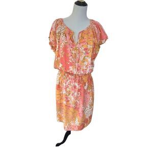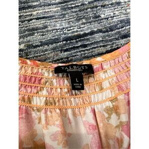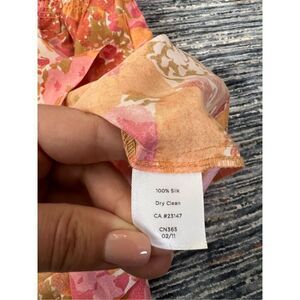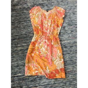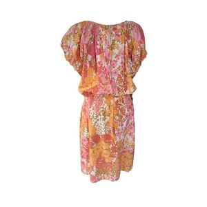 Talbots Dress Orange Pink Floral Print Cap Sleeve Cinched Waist Silk Size L