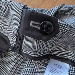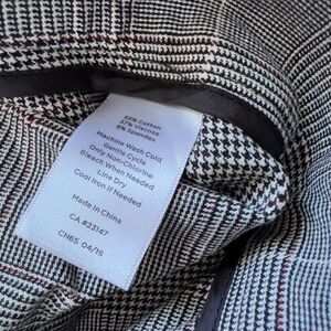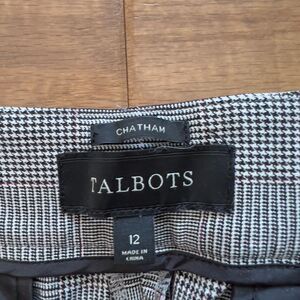 Talbots Chatham Houndstooth Plaid Dress Pants in Black/White. Size 12. Side zip/button closure. 55% cotton, 37% viscose, 8% spandex. The back pockets have been stitched shut.