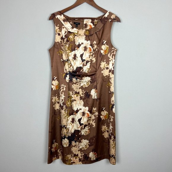 Talbots Dress Womens 12 Brown Floral Sheath Satin Sleeveless Stretch Knee Length
