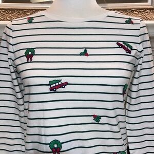 Talbots EMBROIDERED BATEAU NECK TEE - CARS. Gorgeous embroidery makes this long sleeve t-shirt a standout. Crafted from lightweight cotton with an easy bateau neck. In a timeless stripe print with whimsical embroidery. Long Sleeve, Hits At Hip, Bateau Neck, Straight hem. Excellent condition. Women’s Fit: Petite: please see all pictures.