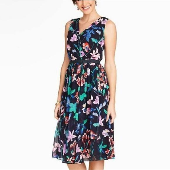 Talbots EUC Women's Navy Floral Pleated Chiffon Surplice Neck Sleeveless Dress 16P
