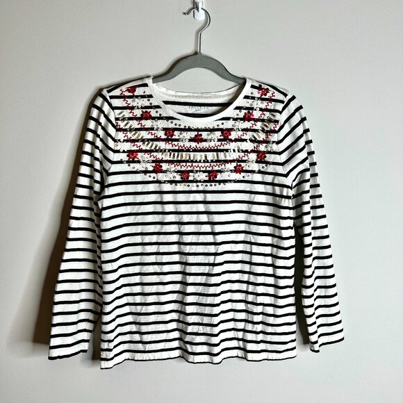 Talbots Embellished Long-Sleeve Stripe Tee Holiday Beaded Snowflakes Cotton MP