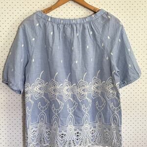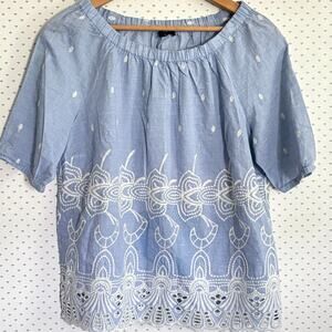 Talbots Embroidered Eyelet Blouse. Elasticized off shoulder. Blue with white embroidered eyelet details. Excellent condition. Size MP.