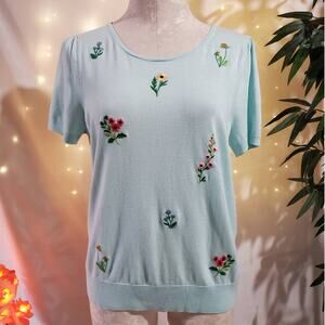 Talbots Embroidered Floral Cottage Light Blue Short Sleeve Knit Sweater Top Womens Size L Petite