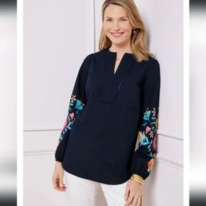 Elevate your wardrobe with this chic Talbots poplin top featuring beautiful embroidered sleeves and a flattering split neckline.