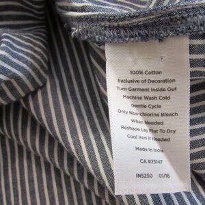 100% cotton. Blue and white vertical stripes with embroidery down the sleeves.