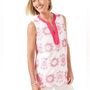 Talbots embroidered tunic shell in a pink and white artistic medallion pattern. This sleeveless tunic features allover embroidery, trapunto stitching at the split neck, a scallop hem, and lining. Pullover style.