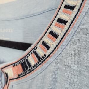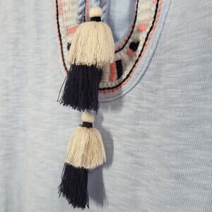 Talbots Embroidered Split Neck Tassel Tunic Top XL Blue Boho Peasant Western Artsy
