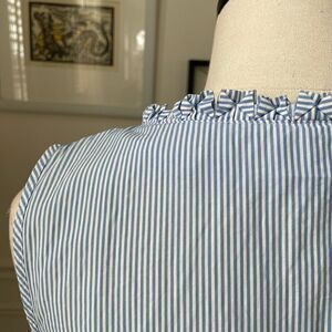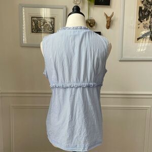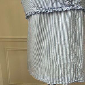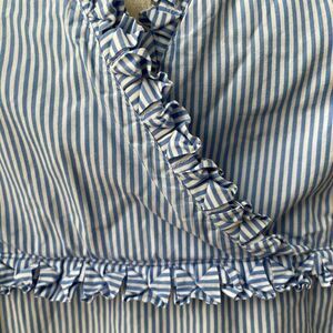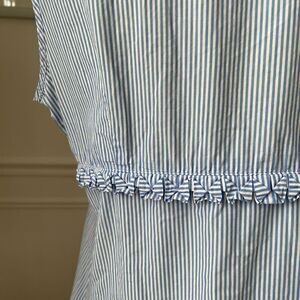 Talbots women’s blue and white stripe sleeveless shell with side, zip closure and ruffle neck line and just below the bust. Fitted through the bust before flowing to a more relaxed fit through the torso. 100% cotton or excellent breathability. Laying flat measures 24 inches shoulder to hand and 19 inches armpit armpit with a little bit of flexibility in the Cross front for cup size.