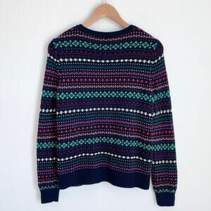 Medium PETITE Talbots cardigan. Navy with a multi-colored fair isle pattern. Sequins on the front for a subtle shine. Crew neckline with a button up front. Soft and cozy. Great condition!