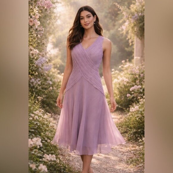 This Talbots lilac midi dress is crafted from pure silk with a delicately pleated wrap-style bodice and a soft, flowing skirt that drapes beautifully. The V-neckline and sleeveless silhouette create an elegant, feminine shape, while the airy silk fabric gives it a dreamy Fairycore feel that’s romantic, ethereal, and timeless. Ideal for garden parties, weddings, special occasions, or any moment that calls for soft elegance and graceful movement. Size 6.