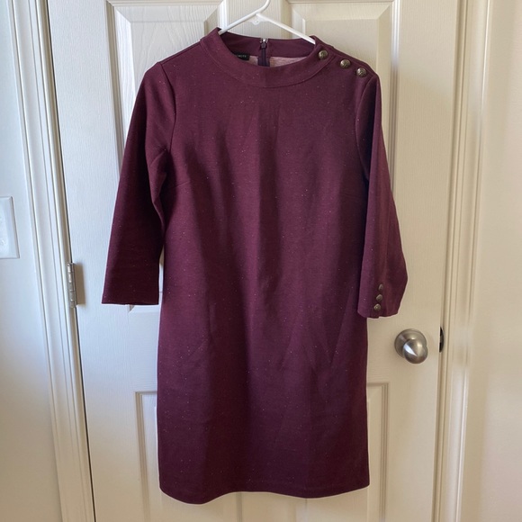 This simple 3/4 sleeved dress can be dressed up or down. Comfy cotton/polyester blend. No tags but brand new. Adorable with boots or booties. Button detail on sleeves and left shoulder.
