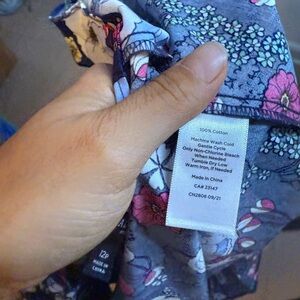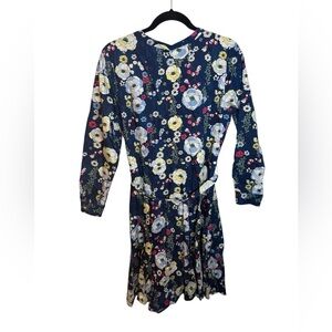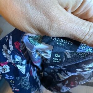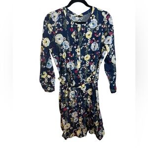 Pre owned excellent condition worn once. The only flaw is the very top bottom is loose and will likely need to be re-stitched. Otherwise perfect. Stunning navy blue floral button front shirt dress with belted waist. So gorgeous and perfect for spring and summer. WOMENS size 12 petite.