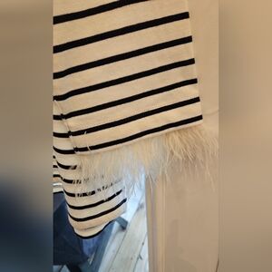 Everything’s better with a touch of subtle glam. Add emphasis to every gesture in this feather-trimmed, cuffed tee. Crafted from lightweight cotton with allover stripes and three-quarter sleeves. The ostrich feathers are removable. Irresistible and chic.