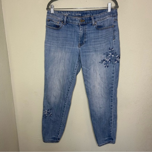 tags: Talbots jeans, girlfriend jeans, embroidered jeans, cropped jeans, size 6 jeans, women's denim, stylish jeans, casual chic, embroidered details, high-quality jeans, Talbots denim, spring fashion, summer style, classic fit jeans, trendy jeans, versatile jeans
