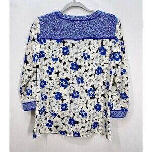 Talbots Floral 3/4 Sleeve Top Womens Small Blue White Notch Neck Popover Preppy. Excellent pre-owned condition with no flaws found. Measurements in photos. Fast shipping!