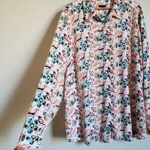 Talbots Floral Bird Outdoor Nature Novelty Print Button Front Tunic Top Roll Tab Long Sleeves Multicolor Pink Blue Size Women's 2X Plus