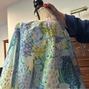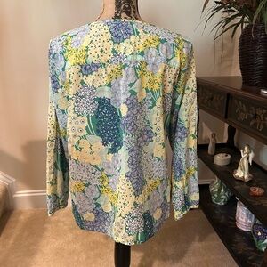 Chic floral blouse by Talbots. Features a vibrant mix of blue and yellow flowers. Perfect for a stylish look.
