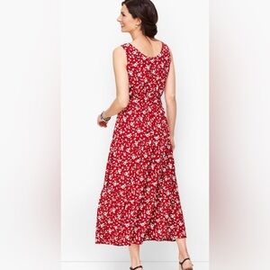 Feminine, flowy, and perfect for sunny days—this sleeveless tiered maxi dress from Talbots brings cheerful elegance to your warm-weather wardrobe. Designed in lightweight crepe with a vibrant red background and an allover navy and white floral print, it features a scoop neckline, flattering waist tie, and breezy tiers that move beautifully.