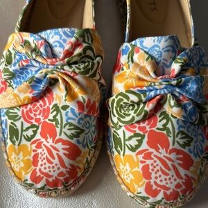 Colorful floral espadrille flats by Talbots. Features a vibrant design with a bow accent.