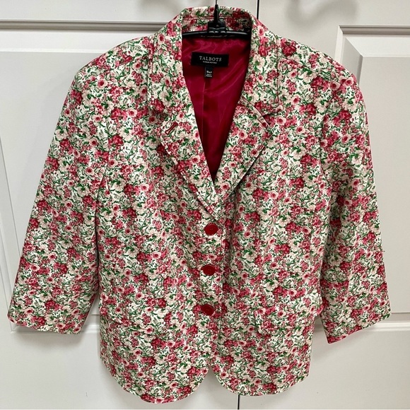 Talbots Floral Grace Fitted Cotton Blend Lined Pockets Button Rose Blazer Jacket